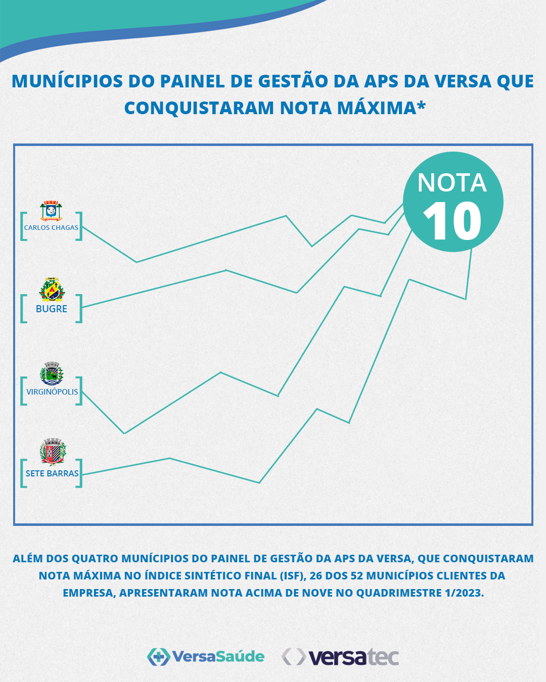 O Ministério da Saúde divulgou no fim da tarde de quarta-feira, dia 24, o desempenho dos municípios brasileiros no ranking dos indicadores do programa Previne Brasil, nos quatro primeiros meses de 2023. Quatro munícipios do Painel de Gestão da APS, plataforma que compõe o Versa Saúde, programa de informatização de serviços em saúde pública municipal da VersaTec, conquistaram nota máxima. Além de Bugre, Virginópolis, Carlos Chagas e Sete Barras, com nota 10 no Índice Sintético Final (ISF), 26 dos 52 municípios clientes da empresa, apresentaram nota acima de nove no ISF.